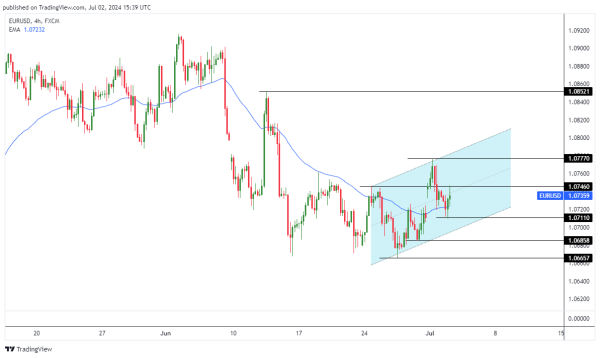 تحليل اليورو مقابل الدولار الأمريكي يتحرك اليورو حول مستوى الدعم 1.0700 مقابل الدولار الأمريكي دون حدوث كسر حاسم. يتداول السعر داخل قناة سعرية صاعدة، مما يوضح احتمالية الاتجاه التالي. إذا أغلق الزوج دون هذا النمط، فقد يستمر في الانخفاض، مستهدفًا مستوى الدعم التالي عند 1.0600. من جهة أخرى، إذا تجاوز الحد العلوي، فقد يعيد اختبار مستوى المقاومة عند 1.0800 قبل أن يواصل هبوطه.